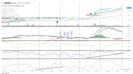 Акции Lockheed Martin (LMT) продолжают идти вверх, несмотря на волатильность на рынке, что подтверждает их устойчивость в условиях коррекции. После сильных июльских отчетов о прибыли бумаги компании достигли нового исторического максимума, даже на фоне снижения S&P 500 на 2%, а с начала года их рост составил 26,02%.